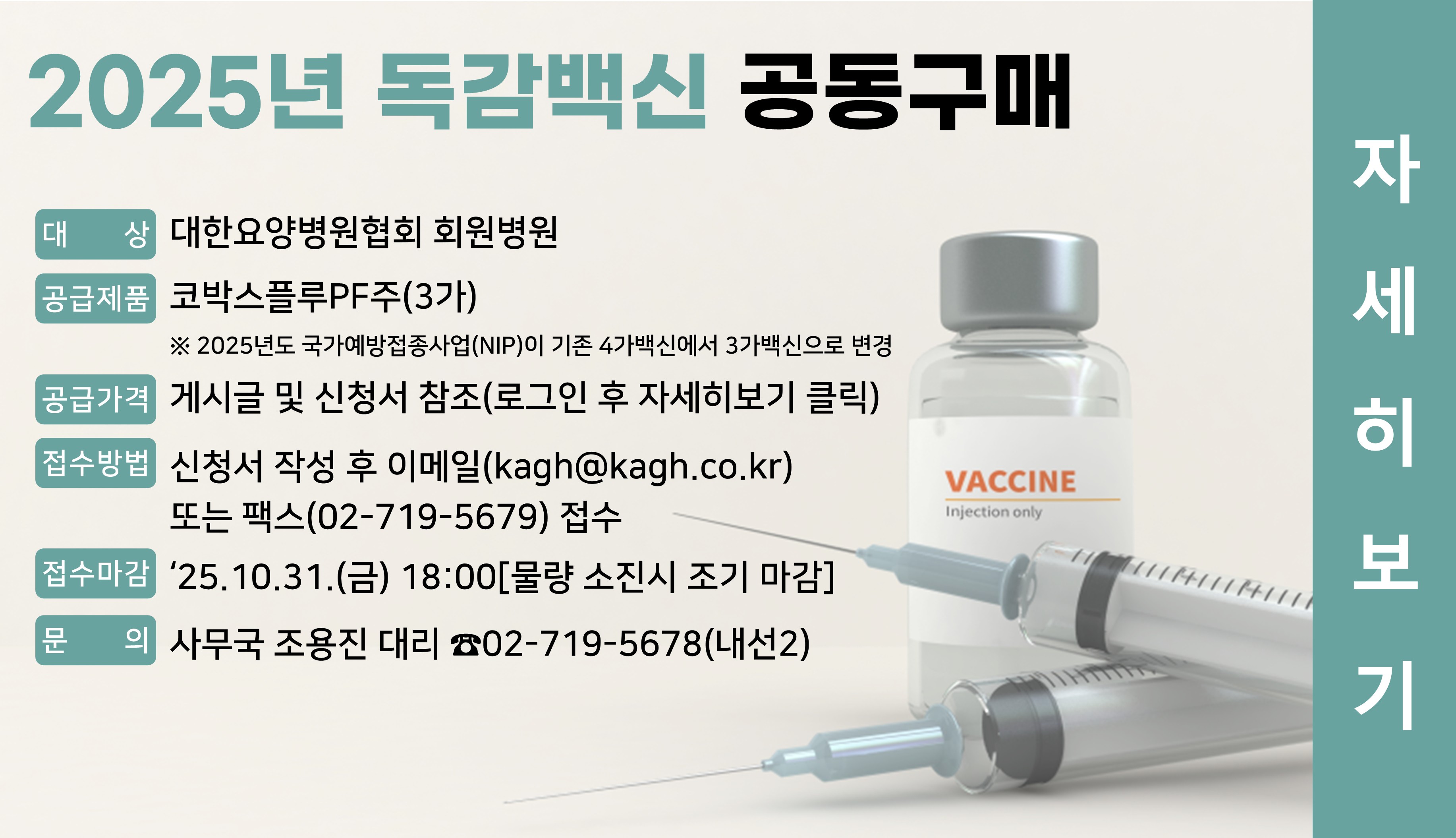 귀 원의 무궁한 발전을 기원합니다. 매년 반복되는 계절성 인플루엔자 유행에 대비하기 위하여, 안정적인 백신 수급은 환자안전과 병원 운영에 있어 매우 중요한 요소입니다. 다만, 백신 공급 시장의 변동성과 가격 불안정으로 인해 개별 병원이 합리적인 조건으로 백신을 확보하는 데 어려움이 있다는 회원병원의 우려가 있었습니다. 이에 협회는 ‘2025 독감백신 공동구매’를 진행한 바 있으며, 여러 회원병원의 추가 구매 요청에 따라 ‘2025 독감백신 2차 공동구매’를 진행하여 안내드리니, 많은 관심과 신청 바랍니다. ※ 2025년도 국가예방접종사업(NIP)이 기존 4가백신에서 3가백신으로 변경됨에 따라, 본 공동구매 또한 3가백신으로 진행되오니 착오 없으시기를 바랍니다. 가. 대상 : 대한요양병원협회 회원병원 나. 공급제품 : 코박스플루PF주 다. 공급가격 : 신청서 참조 라. 접수방법 : 신청서 작성 후 이-메일(kagh@kagh.co.kr) 또는 팩스(02-719-5679) 접수 ※ 신청서 상단 안내사항 필히 확인 마. 접수마감 : 2025. 10. 31.(금) 18:00[물량 소진시 조기 마감] 바. 문의 : 조용진 대리 ☎02-719-5678(내선2)