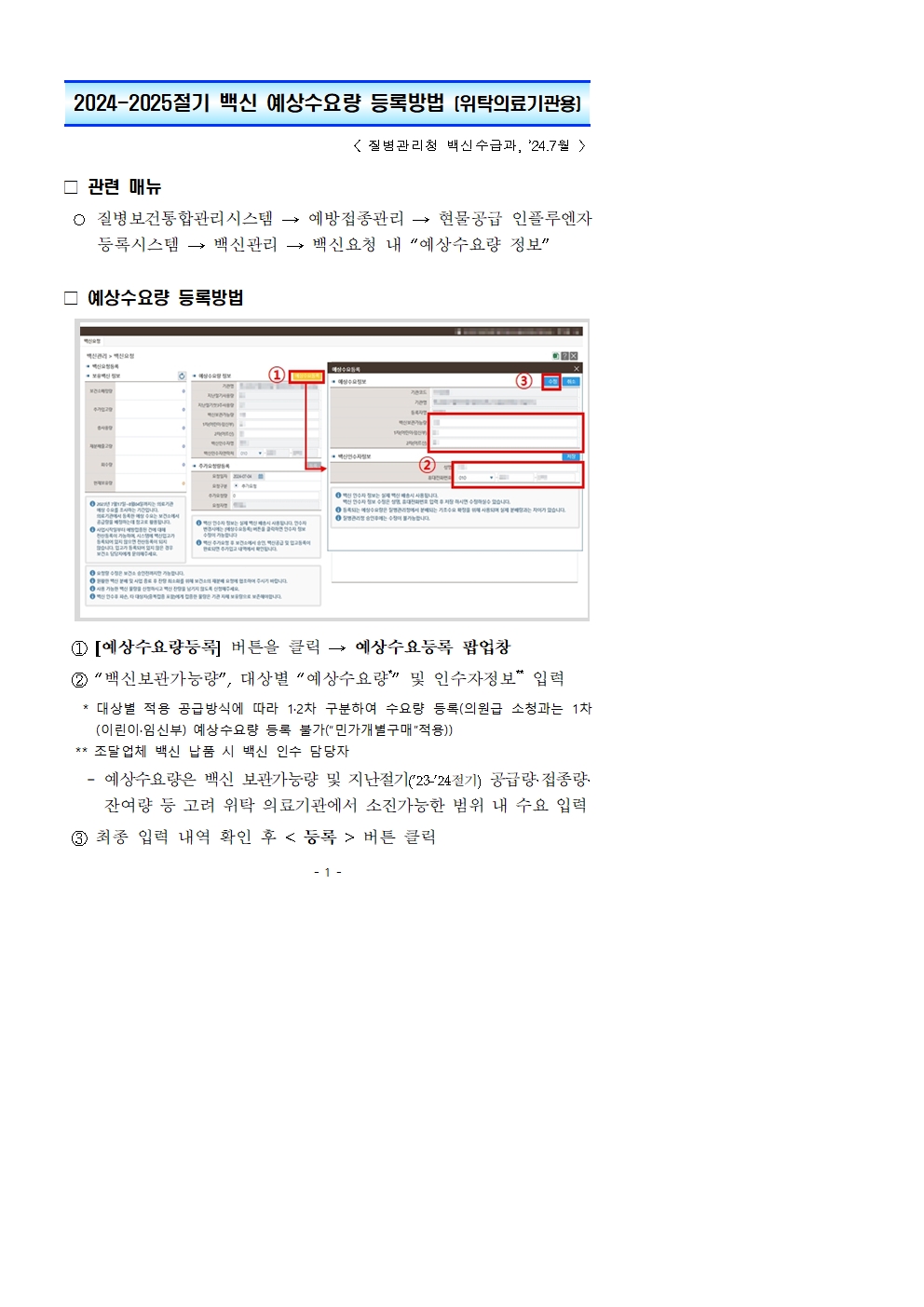 | 첨부파일 232-1_240724_질병관리청_(붙임) 24-25절기 인플루엔자 백신 예상수요량 등록방법(위탁 의료기관용).hwpx | ||||||