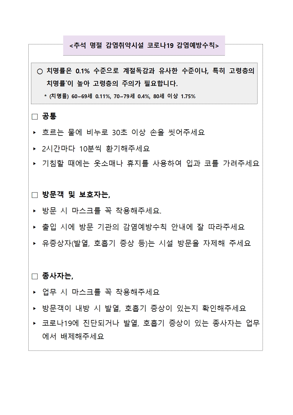 | 첨부파일 공문(24-145)_240911_추석 연휴 기간 요양병원 코로나19 환자 관리 안내.pdf | 붙임. 추석 명절 기간 감염취약시설 예방수칙_최종.hwp | ||||||