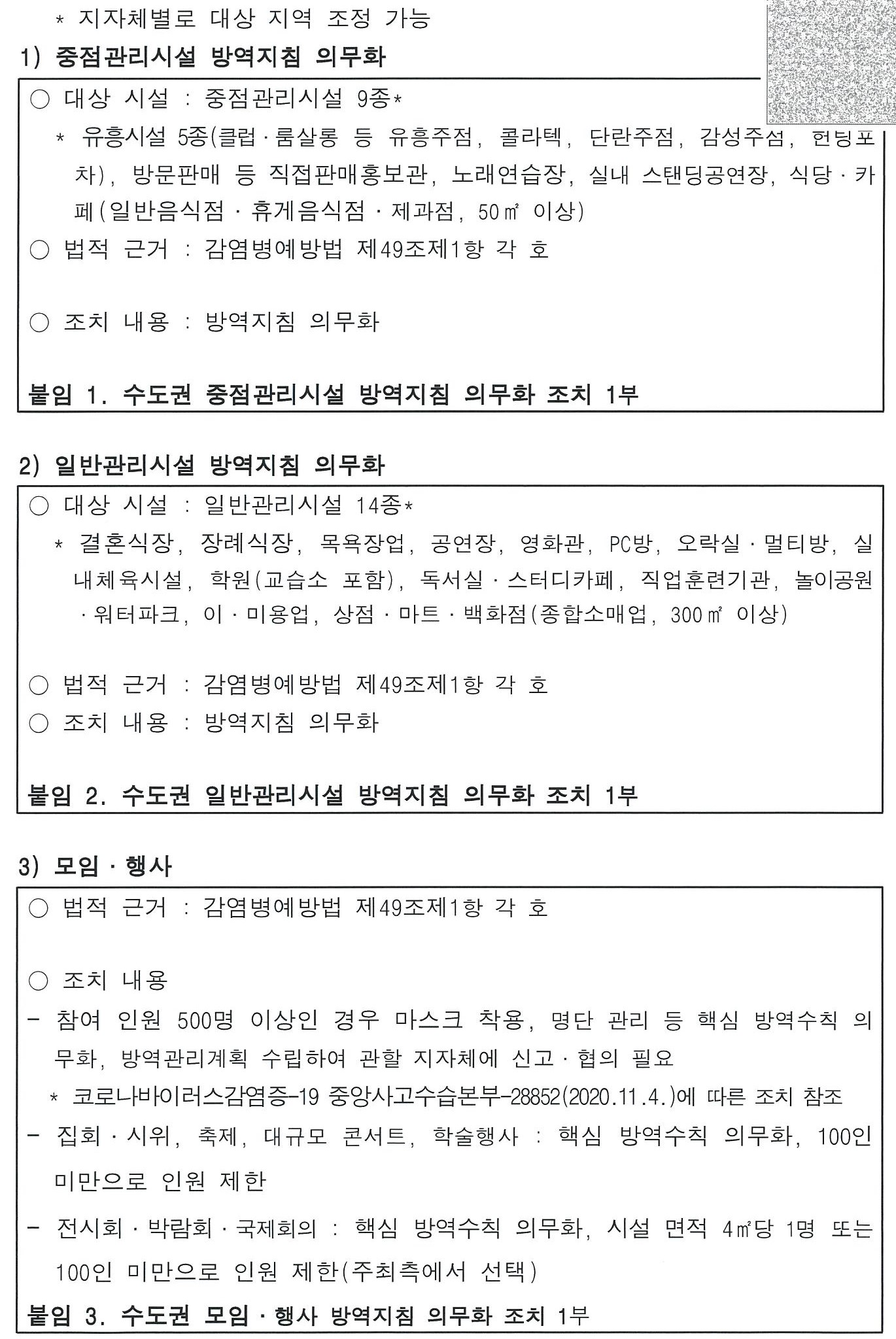 | 첨부파일 324-4_201120_고용노동부_(붙임4)_수도권_종교시설_방역지침_의무화_조치.hwp | 324-5_201120_고용노동부_(붙임5)_수도권_고위험사업장_방역지침_의무화_조치.hwp | 324-3_201120_고용노동부_(붙임3)_수도권_모임행사_방역지침_의무화_조치.hwp | 324-1_201120_고용노동부_(붙임1)_수도권_중점관리시설_방역지침_의무화_조치.hwp | 324-2_201120_고용노동부_(붙임2)_수도권_일반관리시설_방역지침_의무화_조치.hwp | ||||||